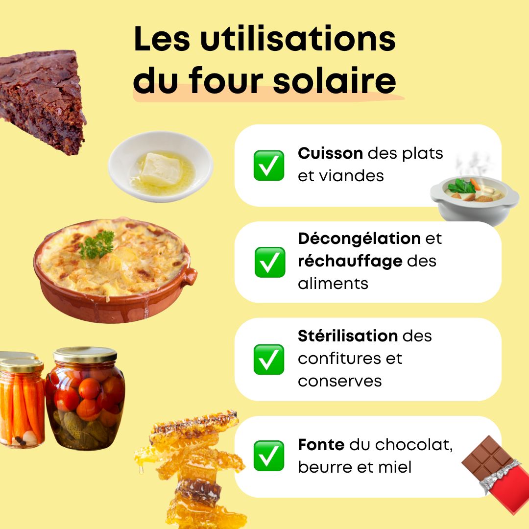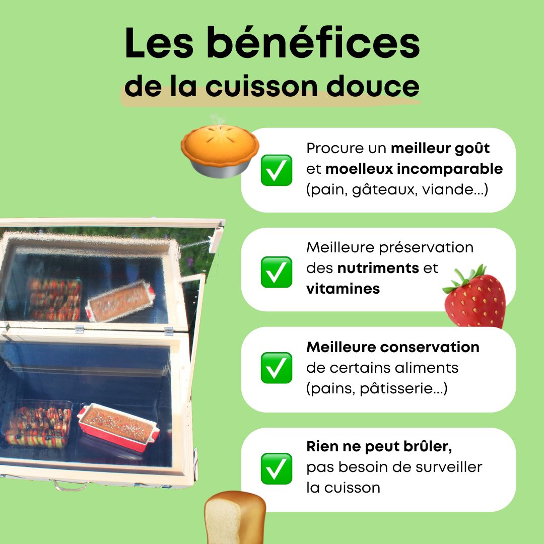 We designed these solar ovens with natural, ecological and bio-sourced materials in order to optimize all your cooking and simplify its use :